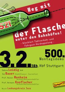 (Am besten eine Plastikflasche mitbringen, als Symbol des „Flaschenhalses“, den S21 darstellt.)