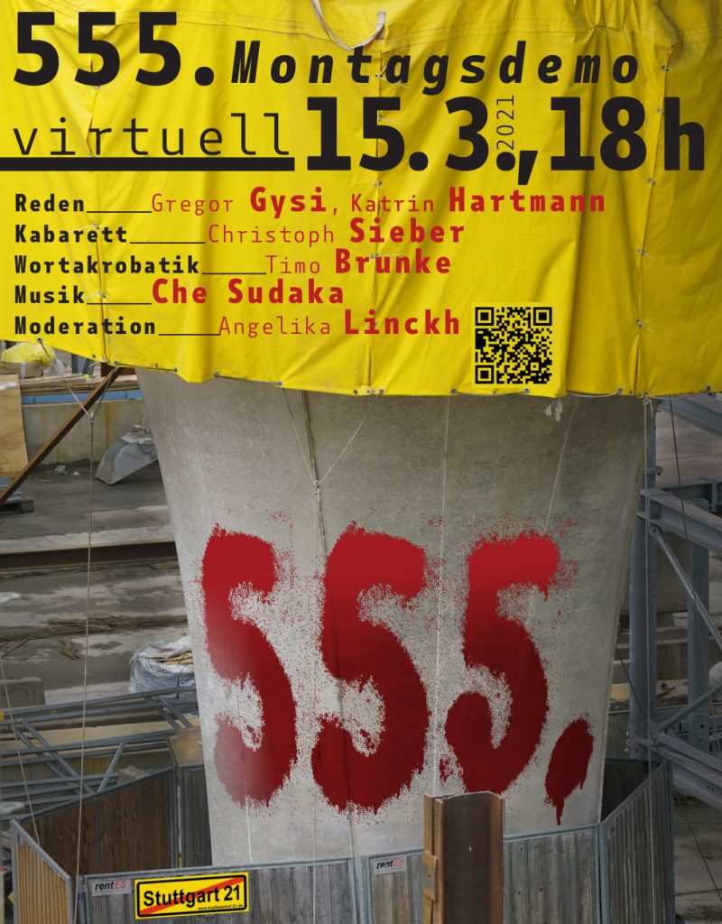 Die 555. Montagsdemo findet am 15. März 2021 nicht auf dem Marktplatz, sondern  um 18 Uhr online statt. Die Kundgebung wird von OBEN BLEIBEN-TV gesendet und ist mit folgenden Links abzurufen: