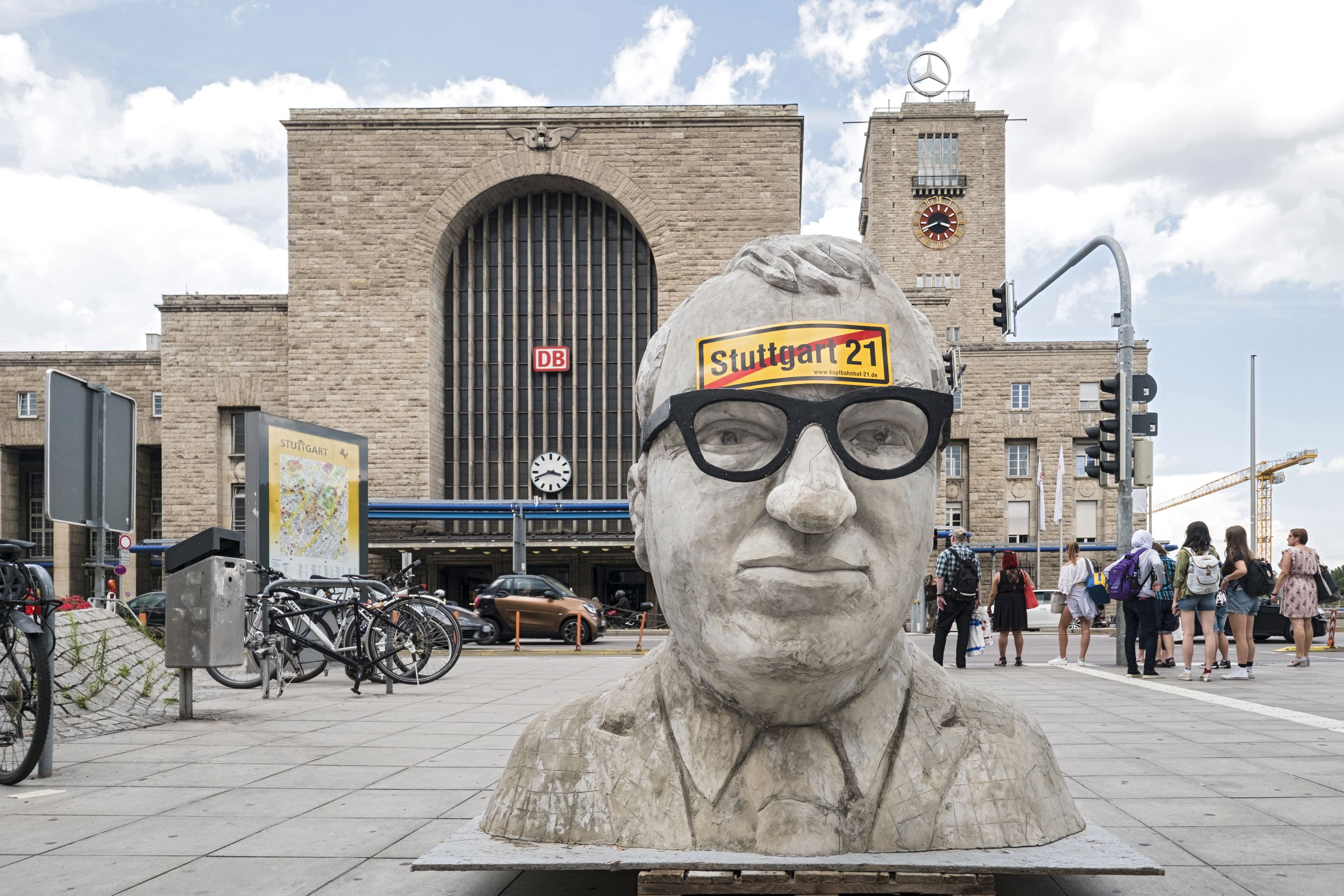Gipsbüste in Betonanmutung des Bundesverkehrsministers Alexander Dobrindt vor dem Hauptbahnhof Stuttgart