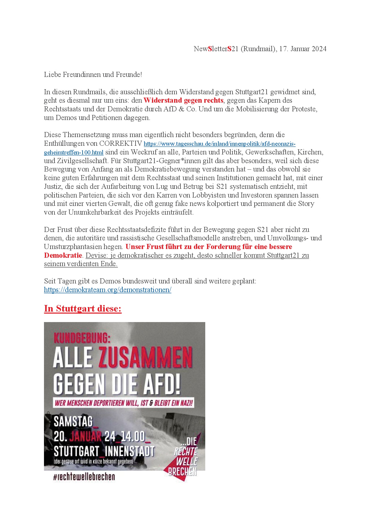 newS21letter (Werners Rundmail) diesmal, ausnahmsweise und aus gegebenem Anlass mit nur einem Thema …