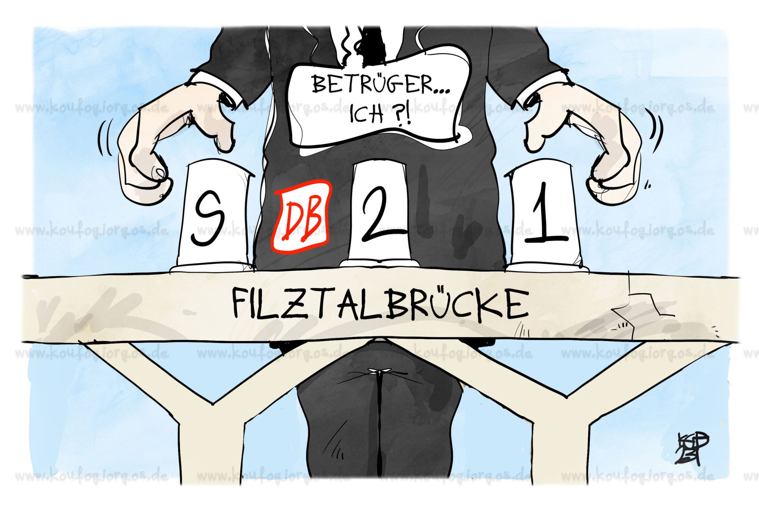 Als Symbol für die Beschleunigung des Schienenverkehrs hat die Deutsche Bahn AG die Filstalbrücke in den Himmel gehoben. Nur drei Wochen nach Inbetriebnahme ist die Brücke als Symbol für Lug und Trug abgestürzt.