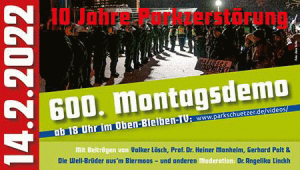 Es ist ein stolzes Jubiläum: sechshundert Montagsdemos! Und außerdem noch der Jahrestag der Parkräumung vor 10 Jahren. Umso schmerzhafter ist, dass die Demo nicht auf der Straße und vor dem Bahnhof stattfinden kann. Das Demoteam hat es sich nicht leicht gemacht mit seiner Entscheidung. Das begründet Angelika Linckh am Ende des Videos der 598. Montagsdemo (ab Min 52:30).