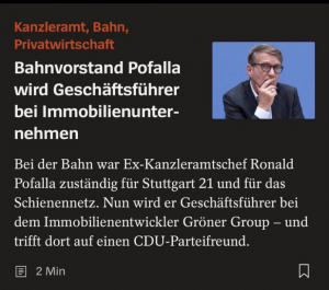 Noch etwas klimaignoranter die Grünen im Stuttgarter Gemeinderat: Sie haben nichts gegen den Abbau 16 funktionsfähiger oberirdischer Gleise, weil sie dort die für die Stadt überlebenswichtige Frischluftschneise zubauen wollen und fordern stattdessen eine 6-gleisige unterirdische Ergänzungsstation, an die inzwischen auch Winfried Herrmann nicht mehr zu glauben schein: Die sei nicht Gegenstand der Beratungen im Lenkungskreis gewesen, und: „Es ergibt keinen Sinn, die hier anzusprechen, wenn ich der Einzige bin, der dafür ist“.