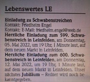 Viele Jahre war diese Anzeige zu den wöchentlichen Schwabenstreichen im Amtsblatt der Stadt Leinfelden-Echterdingen Tradition: