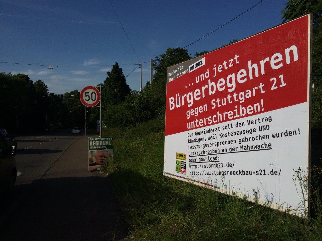 Auf 14 Großplakaten über das ganze Stadtgebiet verteilt konnte eine knappe Woche lang für die Bürgerbegehren geworben werden. Eine Aktion des Aktionsbündnisses (klasse layout mal wieder von Uli Stübeler) unter freundlicher Duldung der LINKEn.